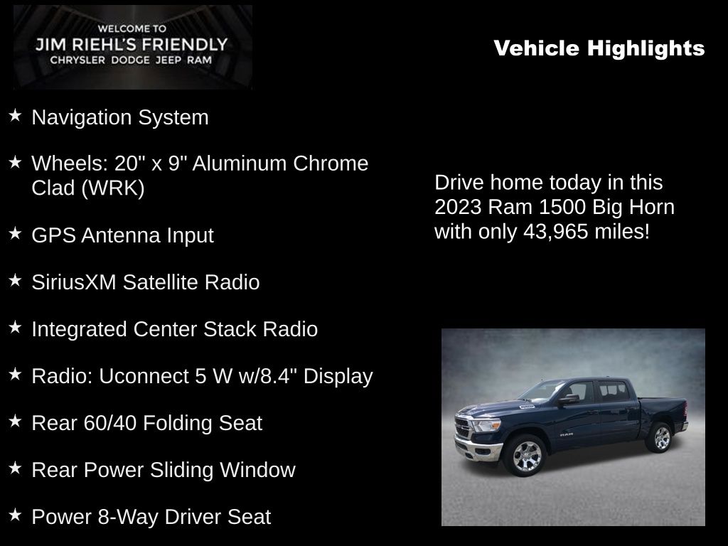 CARFAX One-Owner. Clean CARFAX. 2nd Row In Floor Storage Bins, 4G LTE Wi-Fi Hot Spot, 8.4 Touchscreen Display, Air Conditioning ATC w/Dual Zone Control, Apple CarPlay, Auto-Dimming Exterior Driver Mirror, Auto-Dimming Rear-View Mirror, Big Horn Badge, Big Horn Level 1 Equipment Group, Black Exterior Mirrors, Black Premium Power Mirrors, Bluetooth Handsfree Phone & Audio, Class IV Receiver Hitch, Connectivity - US/Canada, Convex Wide-Angle Exterior Mirror Insert, Delay-off headlights, Electric Shift-On-Demand Transfer Case, Exterior Mirrors Courtesy Lamps, Exterior Mirrors w/Heating Element, Exterior Mirrors w/Supplemental Signals, For Details, Visit DriveUconnect.com, For More Info, Call 800-643-2112, Front Fog Lamps, Fully automatic headlights, Glove Box Lamp, Google Android Auto, GPS Antenna Input, Heated Front Seats, Heated Steering Wheel, Illuminated entry, Integrated Center Stack Radio, Navigation System, ParkView Rear Back-Up Camera, Passenger Sun Visor w/Illuminated Mirror, Power 8-Way Driver Seat, Power-Folding Mirrors, Quick Order Package 23Z Big Horn, Radio: Uconnect 5 W w/8.4 Display, Rear 60/40 Folding Seat, Rear Dome w/On/Off Switch Lamp, Rear Power Sliding Window, Rear Window Defroster, Remote keyless entry, Remote Start System, SiriusXM Satellite Radio, Split folding rear seat, USB Host Flip, Wheels: 20 x 9 Aluminum Chrome Clad (WRK).