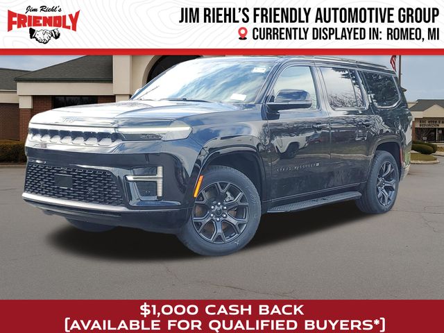 Check out all the standard equipment Altitude Appearance Package, Quick Order Package 29X Altitude (Black Exterior Accents, Titanium Daylight Opening Upper, Titanium Upper Grille Applique, and Wheels: 20" x 9" Aluminum Painted), 118 Mph Maximum Speed Calibration, 3.55 Rear Axle Ratio, 3rd row seats: bench, 4-Wheel Disc Brakes, 9 Speakers, ABS brakes, Air Conditioning, Alloy wheels, AM/FM radio: SiriusXM with 360L, Anti-whiplash front head restraints, Apple CarPlay/Android Auto, Audio memory, Auto Adjust in Reverse Exterior Mirrors, Auto High-beam Headlights, Auto-dimming door mirrors, Auto-Dimming Exterior Driver Mirror, Auto-dimming Rear-View mirror, Auto-leveling suspension, Automatic temperature control, Brake assist, Bumpers: body-color, Compass, Delay-off headlights, Driver door bin, Driver vanity mirror, Driver's Seat Mounted Armrest, Dual front impact airbags, Dual front side impact airbags, Electronic Stability Control, Emergency communication system: Jeep Connect, Exterior Mirrors Approach Lamps, Exterior Mirrors with Memory, Exterior Mirrors with Supplemental Signals, Exterior Parking Camera Rear, Four wheel independent suspension, Front anti-roll bar, Front Bucket Seats, Front Center Armrest w/Storage, Front dual zone A/C, Front fog lights, Front reading lights, Fully automatic headlights, Garage door transmitter, Heated door mirrors, Heated Exterior Mirrors, Heated front seats, Heated rear seats, Heated steering wheel, Illuminated entry, Knee airbag, Leather Trimmed Bucket Seats, Low tire pressure warning, Manufacturer Statement of Origin, Memory seat, MyFlexCare Service Plan, Navigation System, Normal Duty Suspension, Occupant sensing airbag, Outside temperature display, Overhead airbag, Overhead console, Panic alarm, Passenger door bin, Passenger seat mounted armrest, Passenger vanity mirror, Power door mirrors, Power driver seat, Power Liftgate, Power passenger seat, Power steering, Power windows, Radio data system, Radio: Uconnect 5 Nav with 12.0" Display, Rain sensing wipers, Rear air conditioning, Rear anti-roll bar, Rear reading lights, Rear seat center armrest, Rear window defroster, Rear window wiper, Reclining 3rd row seat, Remote keyless entry, Security system, Speed control, Speed-sensing steering, Speed-Sensitive Wipers, Split folding rear seat, Steering wheel memory, Steering wheel mounted audio controls, Tachometer, Telescoping steering wheel, Tilt steering wheel, Traction control, Trip computer, Turn signal indicator mirrors, Variably intermittent wipers, Ventilated front seats, Ventilated rear seats, and Voltmeter. Price includes: $1000 - 2026 National Stellantis Loyalty Bonus Cash . Exp. 04/30/2026