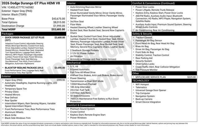 Check out all the standard equipment Blacktop Redline Package (2nd Row Fold/Tumble Captain Chairs, 2nd Row Seat Mounted Inboard Armrests, 6-Passenger Seating, Black Dodge Grille Badge, Black Roof Rails, Blacktop Leather SRT Performance Seats, Crypto Sweep Etch Accents, Gloss Black Badges, Gloss Black Exterior Mirrors, Heated Second Row Seats, Integrated Roof Rail Crossbars, Performance Lower Splitter, Power 8-Way Driver Memory 8-Way Passenger Seats, Power Driver/Passenger 4-Way Lumbar Adjust, Premium Door Trim Panel, Premium Instrument Panel, Satin Black Dodge Tail Lamp Badge, SRT Rear Spoiler, and Ventilated Front Seats), Quick Order Package 22T GT Plus (115V Auxiliary Power Outlet, Auto High Beam Headlamp Control, Auto-Dimming Exterior Driver Mirror, Class IV Receiver Hitch, Dual Remote USB Port - Charge Only, Full Speed Forward Collision Warning Plus, Leather Trimmed Bucket Seats, Leather Wrapped Door Panels, Power 6x9 Multi-Function Foldaway Mirrors, Power Sunroof, Radio/Driver Seat/Mirrors Memory, Red Accent Stitching, and Trailer Brake Control), AWD, 3.09 Rear Axle Ratio, 3rd row seats: split-bench, 4-Wheel Disc Brakes, 9 Speakers, ABS brakes, Air Conditioning, Alloy wheels, AM/FM radio: SiriusXM w/360L, Apple CarPlay/Android Auto, Auto-dimming Rear-View mirror, Auto-leveling suspension, Automatic temperature control, Brake assist, Bumpers: body-color, Compass, Delay-off headlights, Driver door bin, Driver vanity mirror, Dual front impact airbags, Dual front side impact airbags, Electronic Stability Control, Emergency communication system: Dodge Connect, Four wheel independent suspension, Front anti-roll bar, Front Bucket Seats, Front Center Armrest w/Storage, Front dual zone A/C, Front reading lights, Fully automatic headlights, Garage door transmitter, Heated door mirrors, Heated front seats, Heated steering wheel, Illuminated entry, Knee airbag, Leather steering wheel, Low tire pressure warning, MyFlexCare Service Plan, Navigation System, Occupant sensing airbag, Outside temperature display, Overhead airbag, Overhead console, Panic alarm, ParkView Rear Back-Up Camera, Passenger door bin, Passenger vanity mirror, Power door mirrors, Power driver seat, Power Liftgate, Power steering, Power windows, Radio data system, Rain sensing wipers, Rear air conditioning, Rear anti-roll bar, Rear Load Leveling Suspension, Rear reading lights, Rear seat center armrest, Rear window defroster, Rear window wiper, Remote keyless entry, Security system, Speed control, Speed-sensing steering, Speed-Sensitive Wipers, Split folding rear seat, Spoiler, Sport steering wheel, Steering wheel mounted audio controls, Tachometer, Telescoping steering wheel, Tilt steering wheel, Traction control, Trip computer, Variably intermittent wipers, Voltmeter, Wheels: 20" x 8" Black Noise Split 5-Spoke, and Wheels: 20" x 8" Satin Carbon Split 5-Spoke.