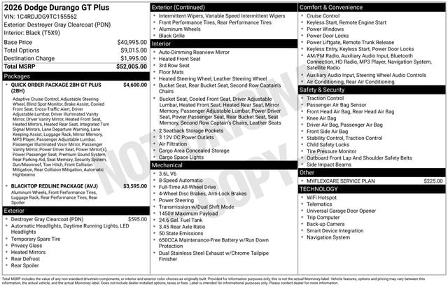 Check out all the standard equipment Blacktop Redline Package (2nd Row Fold/Tumble Captain Chairs, 2nd Row Seat Mounted Inboard Armrests, 6-Passenger Seating, Black Roof Rails, Blacktop Leather SRT Performance Seats, Crypto Sweep Etch Accents, Gloss Black Badges, Gloss Black Exterior Mirrors, Heated Second Row Seats, Integrated Roof Rail Crossbars, Performance Hood, Performance Lower Splitter, Power 8-Way Driver Memory 8-Way Passenger Seats, Power Driver/Passenger 4-Way Lumbar Adjust, Premium Door Trim Panel, Premium Instrument Panel, Satin Black Dodge Tail Lamp Badge, SRT Rear Spoiler, Ventilated Front Seats, and Wheels: 20" x 8" Black Noise Aluminum), Quick Order Package 2BH GT Plus (115V Auxiliary Power Outlet, 180 Amp Alternator, 506 Watt Amplifier, Advanced Brake Assist, Auto High Beam Headlamp Control, Auto-Dimming Exterior Driver Mirror, Bright Cargo Area Scuff Pads, Class IV Receiver Hitch, Dual Remote USB Port - Charge Only, Full Speed Forward Collision Warning Plus, Heavy-Duty Engine Cooling, Lane Departure Warning Plus, Leather Trimmed Bucket Seats, Leather Wrapped Door Panels, Power 6x9 Multi-Function Foldaway Mirrors, Power Sunroof, Rear Load Leveling Suspension, Red Accent Stitching, Security Alarm, Trailer Brake Control, and Wireless Charging Pad), AWD, 3.45 Rear Axle Ratio, 3rd row seats: split-bench, 4-Wheel Disc Brakes, 6 Speakers, ABS brakes, Air Conditioning, Alloy wheels, AM/FM radio: SiriusXM w/360L, Apple CarPlay/Android Auto, Auto-dimming Rear-View mirror, Automatic temperature control, Brake assist, Bumpers: body-color, Compass, Delay-off headlights, Driver door bin, Driver vanity mirror, Dual front impact airbags, Dual front side impact airbags, Electronic Stability Control, Emergency communication system: Dodge Connect, Four wheel independent suspension, Front anti-roll bar, Front Bucket Seats, Front Center Armrest w/Storage, Front dual zone A/C, Front reading lights, Fully automatic headlights, Garage door transmitter, Heated door mirrors, Heated front seats, Heated steering wheel, Illuminated entry, Knee airbag, Leather steering wheel, Low tire pressure warning, MyFlexCare Service Plan, Navigation System, Occupant sensing airbag, Outside temperature display, Overhead airbag, Overhead console, Panic alarm, ParkView Rear Back-Up Camera, Passenger door bin, Passenger vanity mirror, Power door mirrors, Power driver seat, Power Liftgate, Power steering, Power windows, Radio data system, Rear air conditioning, Rear anti-roll bar, Rear reading lights, Rear seat center armrest, Rear window defroster, Rear window wiper, Remote keyless entry, Speed control, Speed-sensing steering, Speed-Sensitive Wipers, Split folding rear seat, Spoiler, Sport steering wheel, Steering wheel mounted audio controls, Tachometer, Telescoping steering wheel, Tilt steering wheel, Traction control, Trip computer, Variably intermittent wipers, Voltmeter, and Wheels: 20" x 8" Fine Silver. Price includes: $1000 - 2026 National Engine Retail Bonus Cash . Exp. 04/30/2026