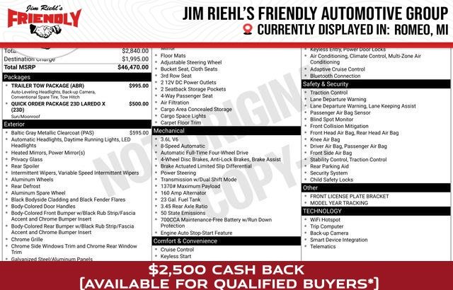 Check out all the standard equipment Quick Order Package 23D Laredo X (Laredo X and Power Sunroof), Trailer Tow Package (180 Amp Alternator, 7 and 4 Pin Wiring Harness, Automatic Headlamp Leveling System, Class IV Receiver Hitch, Dual Exhaust Tips, Heavy-Duty Engine Cooling, Rear Load Leveling Suspension, and Trailer Hitch Zoom), 2nd Row 60/40 Bench with Manual Tip/Slide, 2nd Row Seat Center Armrest/Cupholders, 3 Rear Seat Head Restraints, 3.45 Rear Axle Ratio, 3rd row seats: split-bench, 4-Wheel Disc Brakes, 6 Speakers, 7-Passenger Seating, ABS brakes, Air Conditioning, Alloy wheels, AM/FM radio: SiriusXM, Anti-whiplash front head restraints, Automatic temperature control, Brake assist, Bumpers: body-color, Center Rear 3-Point Seat Belt, Cloth Seats, Compass, Delay-off headlights, Driver door bin, Driver vanity mirror, Dual front impact airbags, Dual front side impact airbags, Electronic Stability Control, Emergency communication system, Four wheel independent suspension, Front anti-roll bar, Front Bucket Seats, Front Center Armrest w/Storage, Front dual zone A/C, Front License Plate Bracket, Front reading lights, Fully automatic headlights, Heated door mirrors, Illuminated entry, Knee airbag, Low tire pressure warning, Manual Fold Seatbacks, Model Year Tracking, Normal Duty Suspension, Occupant sensing airbag, Outside temperature display, Overhead airbag, Overhead console, Panic alarm, ParkView Rear Back-Up Camera, Passenger door bin, Passenger vanity mirror, Power door mirrors, Power driver seat, Power steering, Power windows, Radio data system, Radio: Uconnect 5 with 8.4" Display, Rear air conditioning, Rear anti-roll bar, Rear reading lights, Rear window defroster, Rear window wiper, Reclining 3rd row seat, Remote keyless entry, Security system, Speed control, Speed-Sensitive Wipers, Split folding rear seat, Spoiler, Steering wheel mounted audio controls, Tachometer, Telescoping steering wheel, Tilt steering wheel, Traction control, Trip computer, Variably intermittent wipers, Voltmeter, and Wheels: 18" x 8.0" Fully Painted Aluminum. Price includes: $2500 - 2025 National Retail Bonus Cash . Exp. 04/30/2026