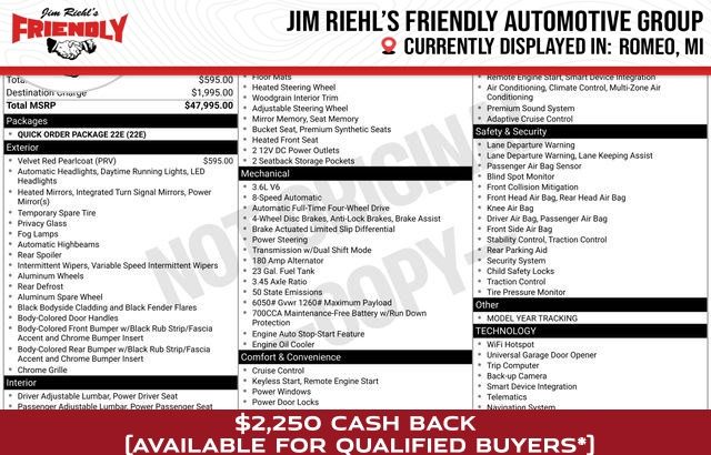 Check out all the standard equipment Quick Order Package 22E, 4WD, 4-Wheel Disc Brakes, 6 Speakers, ABS brakes, Active Noise Control System, Air Conditioning, Alloy wheels, AM/FM radio: SiriusXM with 360L, Anti-whiplash front head restraints, Audio memory, Auto High-beam Headlights, Automatic temperature control, Brake assist, Bumpers: body-color, Capri Leatherette Seats, Compass, Delay-off headlights, Driver door bin, Driver vanity mirror, Dual front impact airbags, Dual front side impact airbags, Electronic Stability Control, Emergency communication system, Four wheel independent suspension, Front anti-roll bar, Front Bucket Seats, Front Center Armrest w/Storage, Front dual zone A/C, Front fog lights, Front reading lights, Fully automatic headlights, Garage door transmitter, Heated door mirrors, Heated front seats, Heated rear seats, Heated steering wheel, Illuminated entry, Knee airbag, Low tire pressure warning, Memory seat, Model Year Tracking, Navigation System, Normal Duty Suspension, Occupant sensing airbag, Outside temperature display, Overhead airbag, Overhead console, Panic alarm, ParkView Rear Back-Up Camera, Passenger door bin, Passenger vanity mirror, Power door mirrors, Power driver seat, Power Liftgate, Power passenger seat, Power steering, Power windows, Radio data system, Radio: Uconnect 5 Nav with 10.1" Display, Rear anti-roll bar, Rear reading lights, Rear window defroster, Rear window wiper, Remote keyless entry, Security system, Speed control, Speed-Sensitive Wipers, Split folding rear seat, Spoiler, Steering wheel mounted audio controls, Tachometer, Telescoping steering wheel, Tilt steering wheel, Traction control, Trip computer, Turn signal indicator mirrors, Variably intermittent wipers, Voltmeter, and Wheels: 18" x 8" Polished/Painted Aluminum. Price includes: $1000 - 2025 National Stellantis Loyalty Bonus Cash . Exp. 03/02/2026 $2000 - 2025 National SFS Lease Loyalty Bonus Cash. Exp. 03/02/2026 $2250 - 2025 National Retail Bonus Cash . Exp. 03/02/2026