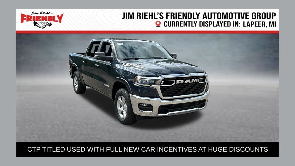 CTP Courtesy Transportation Program Titled used with full new car incentives at huge discounts. This Vehicle is currently located in Lapeer. Welcome to Jim Riehl's Friendly Chrysler Dodge Jeep Ram of Lapeer. Just North of FCA Headquarters on Lapeer Road South of I69. We are delivering vehicles Daily. To your home or office. Please call us today 810.664.2900.