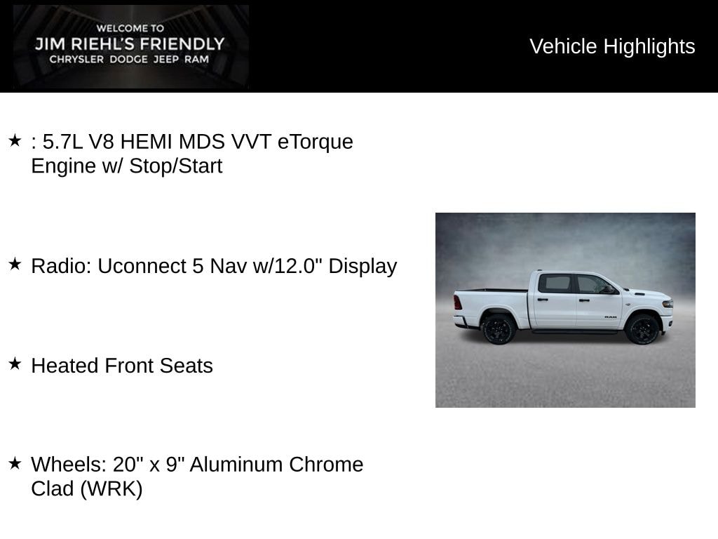 : 5.7L V8 HEMI MDS VVT eTorque Engine w/ Stop/Start, Heated Front Seats.