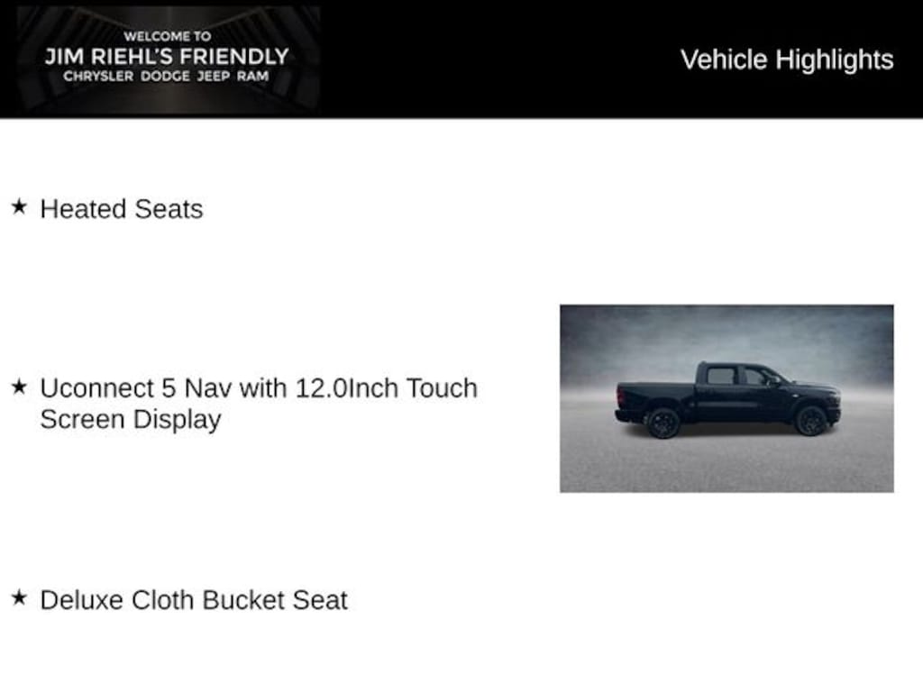 Heated Seats, Uconnect 5 Nav with 12.0Inch Touch Screen Display, Deluxe Cloth Bucket Seat, ABS brakes, Active Cruise Control, Alloy wheels, Compass, Electronic Stability Control, Heated door mirrors, Illuminated entry, Low tire pressure warning, Manual Folding Exterior Mirrors, ParkView Rear Back-Up Camera, Remote keyless entry, Traction control.