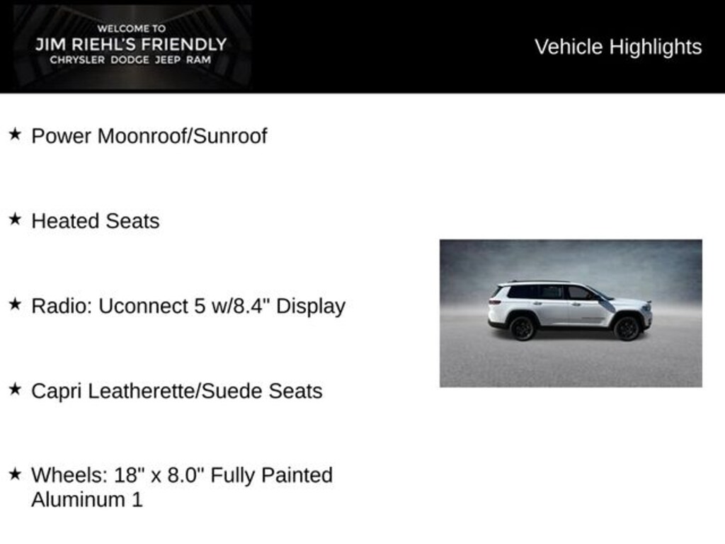 Power Moonroof/Sunroof, Heated Seats, Capri Leatherette/Suede Seats, Radio: Uconnect 5 w/8.4 Display, Wheels: 18 x 8.0 Fully Painted Aluminum 1.
