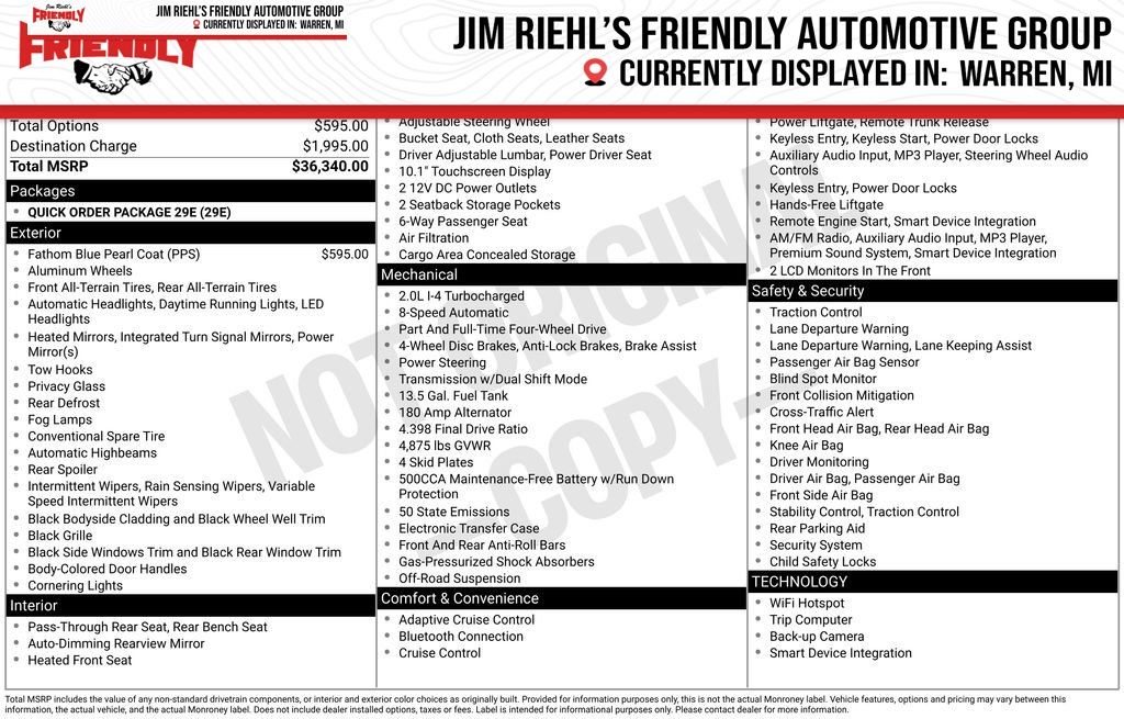 Check out all the standard equipment Quick Order Package 29E, 10.1 Touchscreen Display, 4-Wheel Disc Brakes, 4.398 Final Drive Ratio, 4G LTE Wi-Fi Hot Spot, 6 Speakers, ABS brakes, Air Conditioning, Alloy wheels, AM/FM radio: SiriusXM, Auto High-beam Headlights, Auto-dimming Rear-View mirror, Automatic temperature control, Brake assist, Bumpers: body-color, Compass, Delay-off headlights, Driver door bin, Driver vanity mirror, Dual front impact airbags, Dual front side impact airbags, Electronic Stability Control, Emergency communication system: SiriusXM Guardian, Four wheel independent suspension, Front anti-roll bar, Front Bucket Seats, Front Center Armrest w/Storage, Front dual zone A/C, Front fog lights, Front reading lights, Fully automatic headlights, Global Telematics Box Module, Heated door mirrors, Heated front seats, Heated steering wheel, Illuminated entry, Knee airbag, Leather Shift Knob, Leather steering wheel, Low tire pressure warning, Occupant sensing airbag, Outside temperature display, Overhead airbag, Overhead console, Panic alarm, ParkView Rear Back-Up Camera, Passenger door bin, Passenger vanity mirror, Power door mirrors, Power driver seat, Power Liftgate, Power steering, Power windows, Premium audio system: UConnect 5, Premium Cloth/Leather Trim Bucket Seats, Radio: Uconnect 5 with 10.1 Display, Rain sensing wipers, Rear anti-roll bar, Rear seat center armrest, Rear window defroster, Rear window wiper, Remote keyless entry, Security system, SiriusXM Guardian - Included Trail (B), SiriusXM Radio Service, Speed control, Split folding rear seat, Spoiler, Steering wheel mounted audio controls, Tachometer, Telescoping steering wheel, Tilt steering wheel, Traction control, Trip computer, Turn signal indicator mirrors, Variably intermittent wipers, and Wheels: 17 x 6.5 Painted Black Aluminum. Must qualify for FCA Employee Discount, Price includes: $1000 - 2026 National Retail Bonus Cash . Exp. 03/31/2026 $1000 - 2026 National Stellantis Loyalty Bonus Cash . Exp. 03/31/2026 $1500 - 2026 National SFS Lease Loyalty Bonus Cash . Exp. 03/31/2026 $500 - 2026 Great Lakes BC Bonus Cash . Exp. 03/31/2026