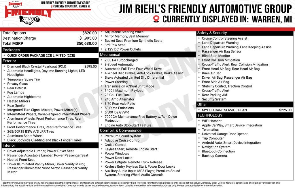 Check out all the standard equipment Quick Order Package 2CE Limited, 10 Speakers, 3.70 Rear Axle Ratio, 3rd row seats: split-bench, 4-Wheel Disc Brakes, 4G LTE Wi-Fi Hot Spot, ABS brakes, Active Noise Control System, Air Conditioning, Alloy wheels, AM/FM radio: SiriusXM with 360L, Anti-whiplash front head restraints, Apple CarPlay, AppLink/Apple CarPlay and Android Auto, Audio memory, Auto High-beam Headlights, Automatic temperature control, Brake assist, Bumpers: body-color, Capri Leatherette Seats, Compass, Connectivity - US/Canada, Delay-off headlights, Disassociated Touchscreen Display, Driver door bin, Driver vanity mirror, Dual front impact airbags, Dual front side impact airbags, Electronic Stability Control, Emergency communication system, For Details, Visit DriveUconnect.com, Four wheel independent suspension, Front anti-roll bar, Front Bucket Seats, Front Center Armrest w/Storage, Front dual zone A/C, Front fog lights, Front reading lights, Fully automatic headlights, Garage door transmitter, Global Telematics Box Module (TBM), Gloss Black Exterior Mirrors, Google Android Auto, GPS Antenna Input, Heated door mirrors, Heated Exterior Mirrors, Heated front seats, Heated rear seats, Heated steering wheel, Illuminated entry, Integrated Center Stack Radio, Integrated Voice Command with Bluetooth, Knee airbag, Low tire pressure warning, Manual Fold Seatbacks, Manual Folding Exterior Mirrors, Memory seat, MyFlexCare Service Plan, Navigation System, Normal Duty Suspension, Occupant sensing airbag, Outside temperature display, Overhead airbag, Overhead console, Panic alarm, ParkView Rear Back-Up Camera, Passenger door bin, Passenger vanity mirror, Power door mirrors, Power driver seat, Power Fold Seatbacks, Power Liftgate, Power passenger seat, Power steering, Power windows, Radio data system, Radio: Uconnect 5 Nav with 12.3 Display, Rear air conditioning, Rear anti-roll bar, Rear reading lights, Rear window defroster, Rear window wiper, Reclining 3rd row seat, Remote keyless entry, Security system, Speed control, Speed-Sensitive Wipers, Split folding rear seat, Spoiler, Steering wheel mounted audio controls, Tachometer, Telescoping steering wheel, Tilt steering wheel, Traction control, Trip computer, Turn signal indicator mirrors, USB Host Flip, Variably intermittent wipers, Voltmeter, Wheels: 18 x 8.0 Polished/Painted Aluminum, and Wheels: 20 x 8.5 Machined/Painted AluminuM. Must qualify for FCA Employee Discount, Price includes: $1000 - 2026 National Stellantis Loyalty Bonus Cash . Exp. 03/02/2026 $2000 - 2026 National SFS Lease Loyalty Bonus Cash . Exp. 03/02/2026