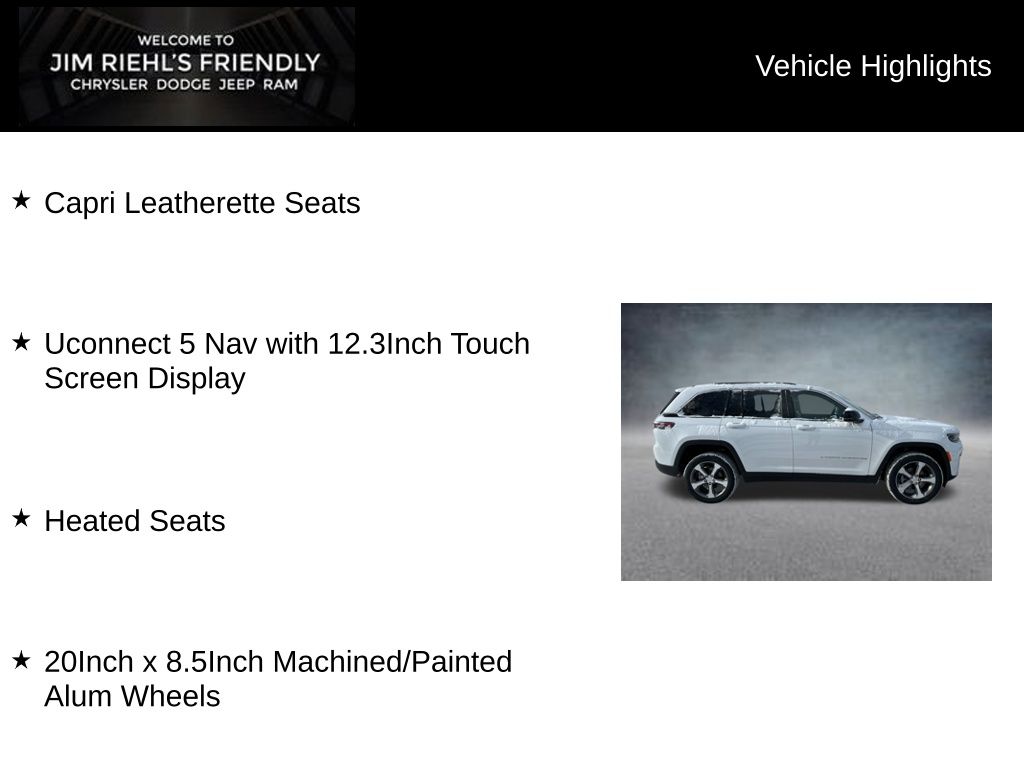 Capri Leatherette Seats, Uconnect 5 Nav with 12.3Inch Touch Screen Display, Heated Seats, 20Inch x 8.5Inch Machined/Painted Alum Wheels, 4WD, ABS brakes, Alloy wheels, Compass, Electronic Stability Control, Emergency communication system, Front dual zone A/C, Heated door mirrors, Heated Exterior Mirrors, Heated front seats, Heated rear seats, Illuminated entry, Low tire pressure warning, Manual Folding Exterior Mirrors, Navigation System, ParkView Rear Back-Up Camera, Power Liftgate, Remote keyless entry, Traction control.