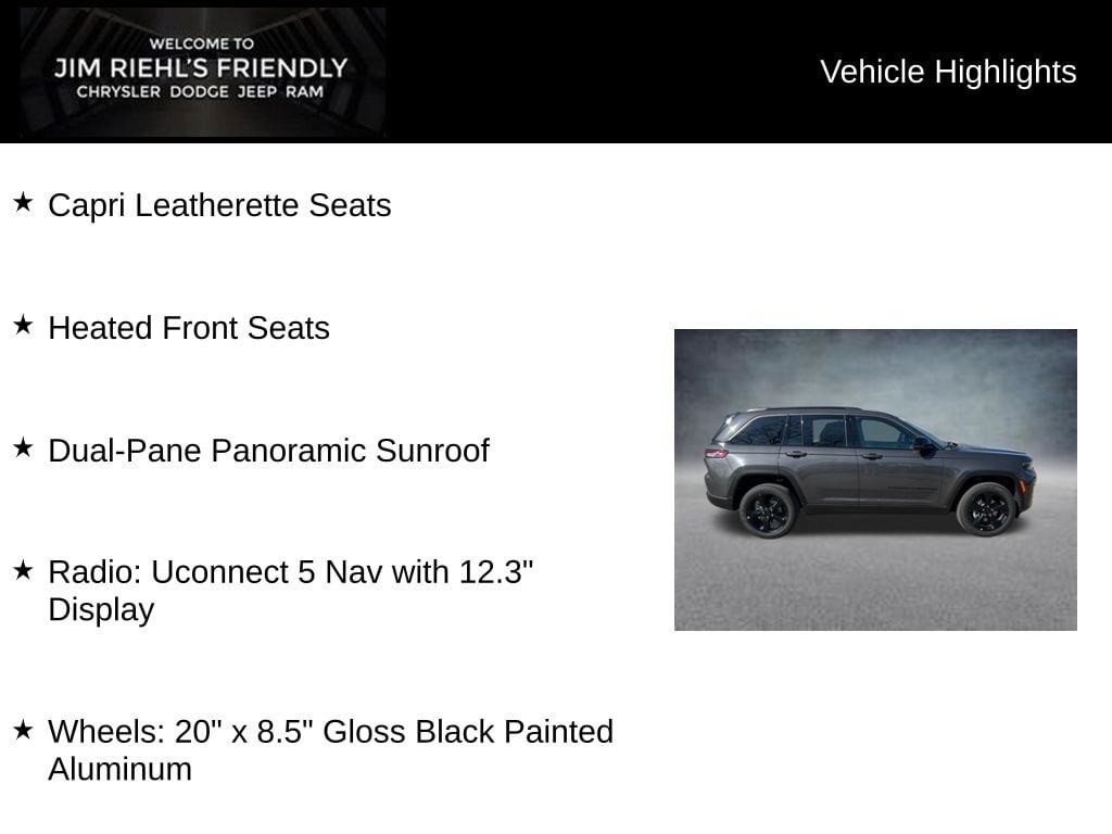 Capri Leatherette Seats, Heated Front Seats, Dual-Pane Panoramic Sunroof, 4WD, Radio: Uconnect 5 Nav with 12.3 Display, Wheels: 20 x 8.5 Gloss Black Painted Aluminum.