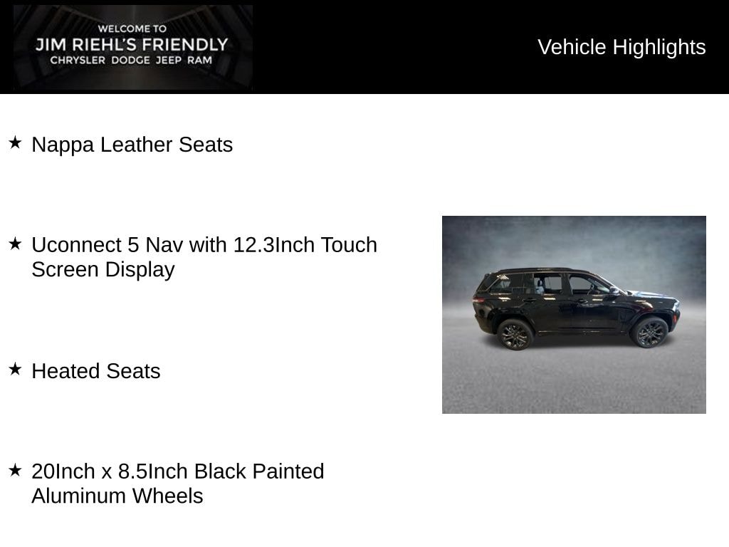 Nappa Leather Seats, Uconnect 5 Nav with 12.3Inch Touch Screen Display, Heated Seats, 20Inch x 8.5Inch Black Painted Aluminum Wheels, 4WD, ABS brakes, Alloy wheels, Compass, Electronic Stability Control, Emergency communication system, Front dual zone A/C, Heated door mirrors, Heated Exterior Mirrors, Heated front seats, Heated rear seats, Illuminated entry, Low tire pressure warning, Manual Folding Exterior Mirrors, Navigation System, ParkView Rear Back-Up Camera, Power Liftgate, Remote keyless entry, Traction control.