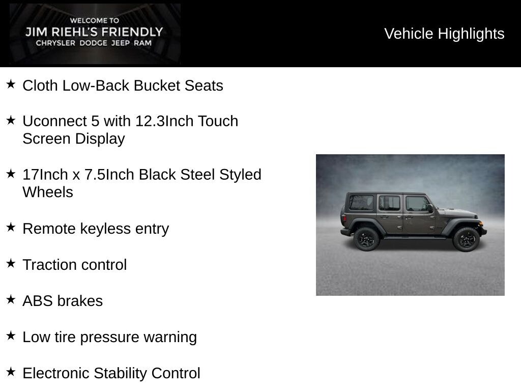 Cloth Low-Back Bucket Seats, Uconnect 5 with 12.3Inch Touch Screen Display, 17Inch x 7.5Inch Black Steel Styled Wheels, ABS brakes, Compass, Electronic Stability Control, Illuminated entry, Low tire pressure warning, ParkView Rear Back-Up Camera, Remote keyless entry, Traction control.