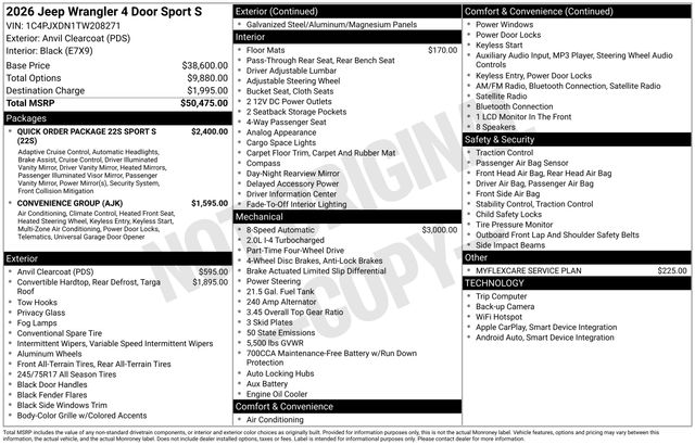 Check out all the standard equipment Convenience Group (2-Door Passive Entry, Front Door Locks, Air Conditioning with Auto Temp Control, Air Filtering, Cluster 7.0" TFT Color Display, Emergency/Assistance Call, Heated Front Seats, Heated Steering Wheel, and Universal Garage Door Opener), Quick Order Package 22S Sport S (Advanced Brake Assist, Automatic Headlamps, Corning Gorilla Glass, Deep Tint Sunscreen Windows, Enhanced Adaptive Cruise Control, Full Speed Forward Collision Warning Plus, Power Heated Mirrors, Premium Wrapped Steering Wheel, Security Alarm, Sun Visors with Illuminated Vanity Mirrors, and Wheels: 17" x 7.5" Gray), 12.3" Touchscreen Display, 3.45 Overall Top Gear Ratio, 4-Wheel Disc Brakes, 4G LTE Wi-Fi Hot Spot, 8 Speakers, ABS brakes, Air Conditioning, AM/FM radio: SiriusXM with 360L, Apple CarPlay, Apple CarPlay/Android Auto, Aux Battery, Black 3-Piece Hard Top, Brake assist, Compass, Connectivity - US/Canada, Delay-off headlights, Driver door bin, Driver vanity mirror, Dual front impact airbags, Dual front side impact airbags, Electronic Stability Control, For More Info, Call 800-643-2112, Freedom Panel Storage Bag, Front anti-roll bar, Front Bucket Seats, Front Center Armrest w/Storage, Front fog lights, Front reading lights, Google Android Auto, Illuminated entry, Integrated Center Stack Radio, Integrated roll-over protection, Low tire pressure warning, Manufacture Statement of Origin, MOPAR All-Weather Floor Mats, Myflexcare Service Plan, No Soft Top, Non-Lock Fuel Cap Without Discriminator, Normal Duty Suspension, Occupant sensing airbag, Outside temperature display, Overhead airbag, Panic alarm, ParkView Rear Back-Up Camera, Passenger door bin, Passenger vanity mirror, Power steering, Power windows, Radio data system, Radio: Uconnect 5 with 12.3" Display, Rear anti-roll bar, Rear reading lights, Rear Window Defroster, Rear Window Wiper/Washer, Remote keyless entry, SiriusXM Radio Service, SiriusXM with 360L, Speed control, Split folding rear seat, Steering wheel mounted audio controls, Stop-Start Dual Battery System, Tachometer, Telescoping steering wheel, Tilt steering wheel, Traction control, Trip computer, Variably intermittent wipers, and Wheels: 17" x 7.5" Black Steel Styled. Price includes: $1000 - 2026 National Stellantis Loyalty Bonus Cash . Exp. 03/31/2026