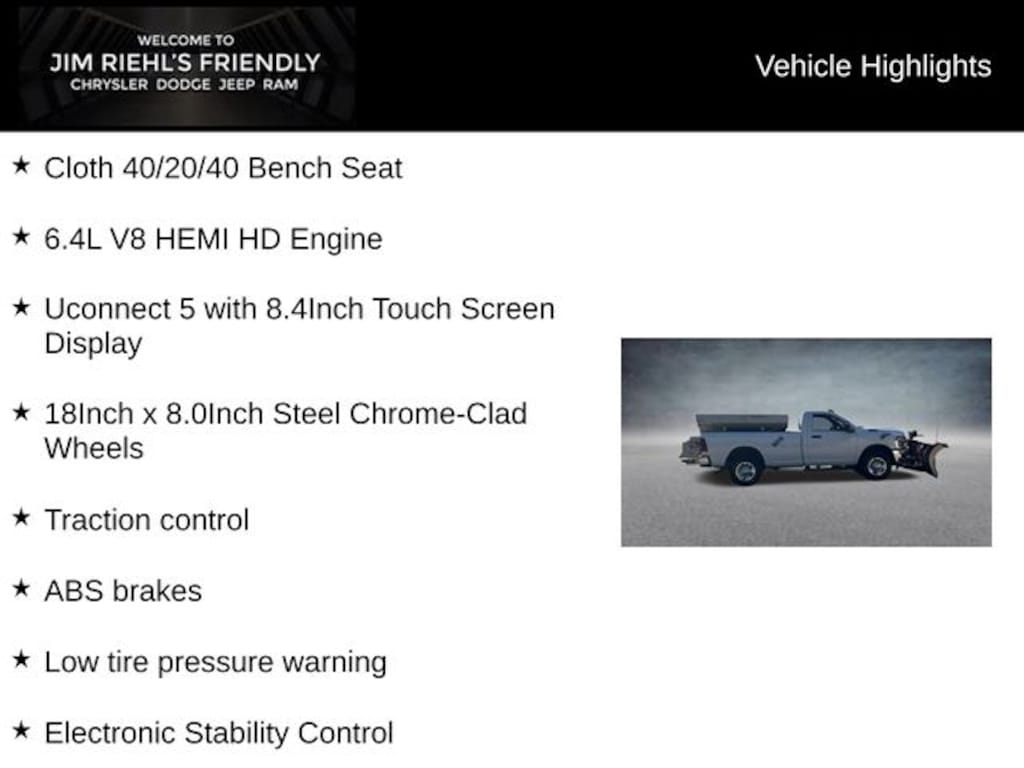 Cloth 40/20/40 Bench Seat, 6.4L V8 HEMI HD Engine, Uconnect 5 with 8.4Inch Touch Screen Display, 18Inch x 8.0Inch Steel Chrome-Clad Wheels, ABS brakes, Compass, Electronic Stability Control, Illuminated entry, Low tire pressure warning, Manual Folding Exterior Mirrors, ParkView Rear Back-Up Camera, Traction control.