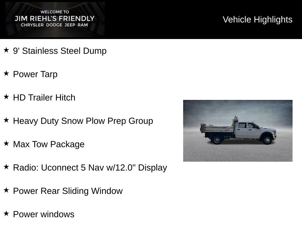 9' Stainless Steel Dump, Power Tarp, HD Trailer Hitch, Apple CarPlay, Google Android Auto, Heavy Duty Snow Plow Prep Group, Max Tow Package, Power Rear Sliding Window, Power windows, Remote keyless entry, Trailer Brake Control.