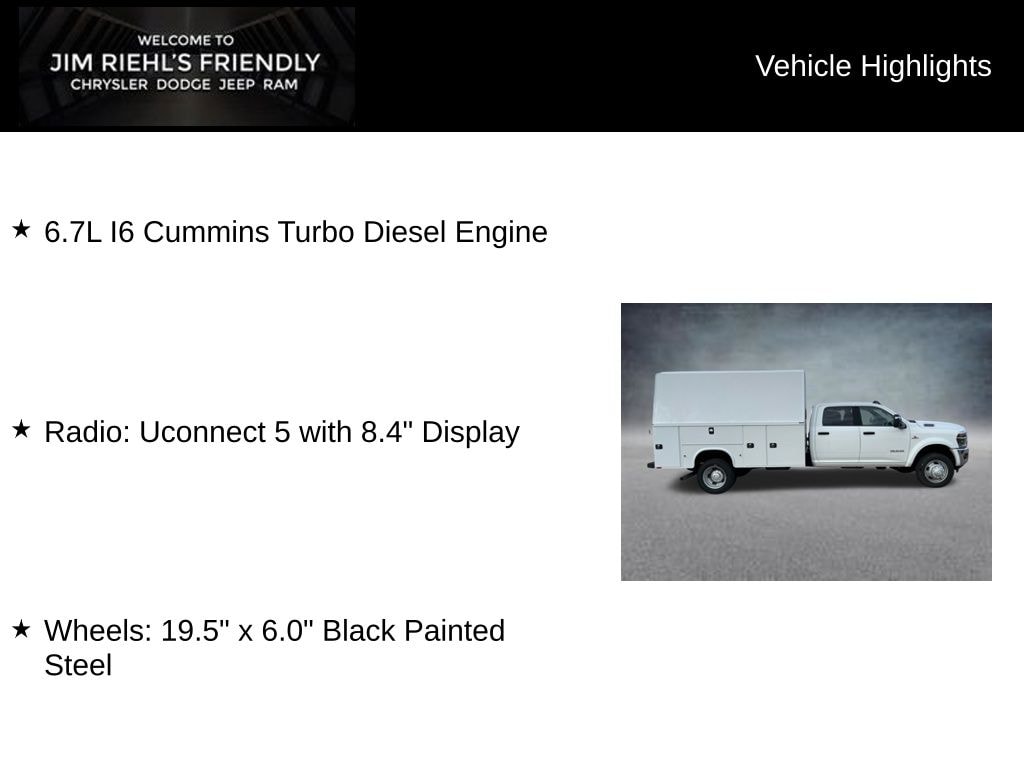 6.7L I6 Cummins Turbo Diesel Engine, Radio: Uconnect 5 with 8.4 Display, Wheels: 19.5 x 6.0 Black Painted Steel.