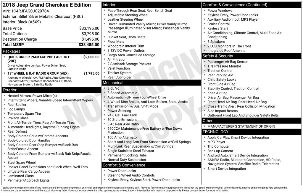 4WD, 18 Wheel & 8.4 Radio Group, Alloy wheels, Apple CarPlay, Auto-Dimming Rear-View Mirror, Delay-off headlights, Front dual zone A/C, Front fog lights, Fully automatic headlights, Heated door mirrors, Illuminated entry, Navigation System, ParkView Rear Back-Up Camera, Radio: Uconnect 4C Nav w/8.4 Display, Remote keyless entry, Split folding rear seat, Wheels: 18 x 8.0 Tech Gray Aluminum.