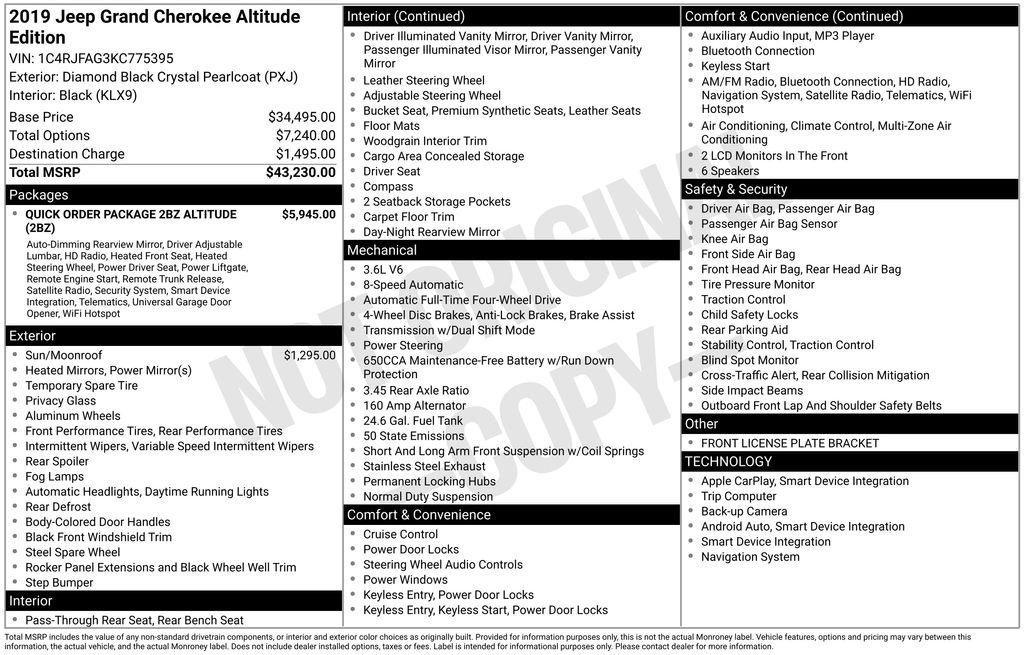 2019 Jeep Grand Cherokee Altitude Diamond Black Crystal Pearlcoat 3.6L V6 24V VVT 8-Speed Automatic 4WD