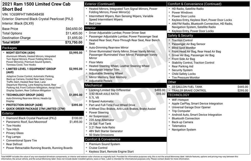 2021 Ram 1500 Limited Diamond Black Crystal Pearlcoat HEMI 5.7L V8 Multi Displacement VVT 8-Speed Automatic 4WD