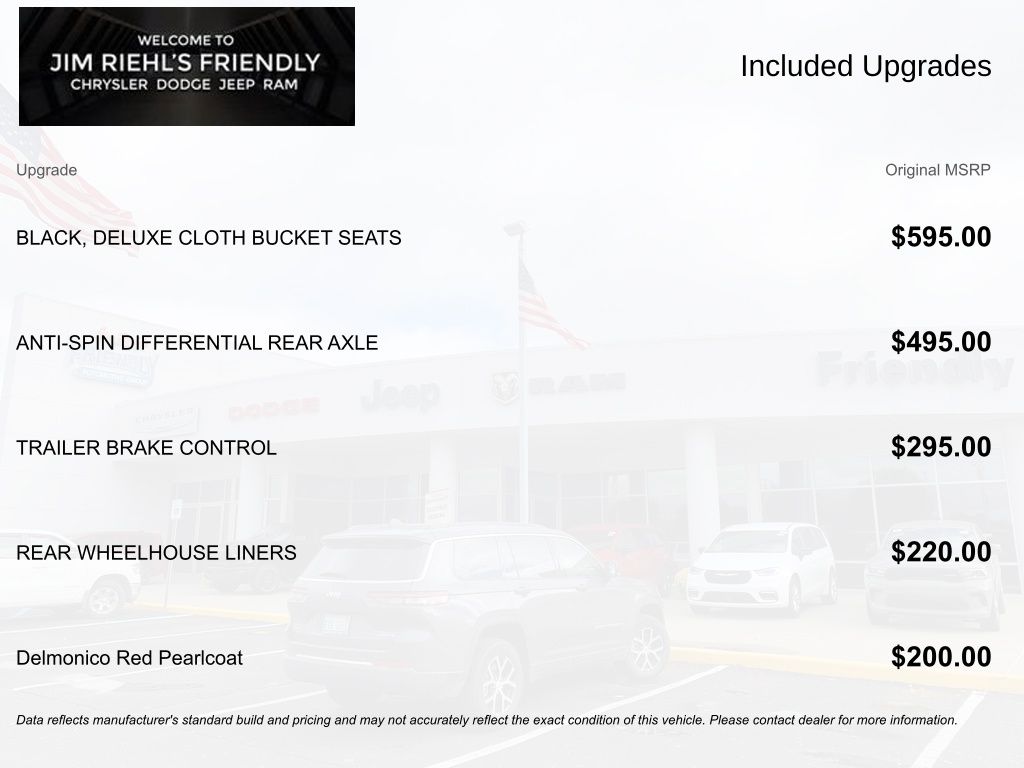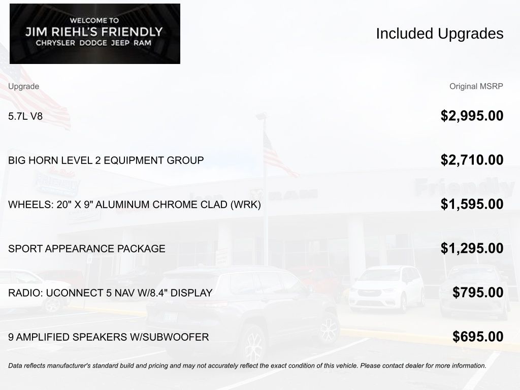Clean CARFAX. 115V Auxiliary Power Outlet, 115V Auxiliary Rear Power Outlet, 2nd Row In Floor Storage Bins, Air Conditioning ATC w/Dual Zone Control, All Plant-Installed Decals, Auto-Dimming Exterior Driver Mirror, Auto-Dimming Rear-View Mirror, Big Horn Badge, Big Horn Level 2 Equipment Group, Black Exterior Mirrors, Black Interior Accents, Black Premium Power Mirrors, Bluetooth Handsfree Phone & Audio, Body Color Exterior Mirrors, Body Color Front Bumper, Body Color Premium Power Mirrors, Body Color Rear Bumper w/Step Pads, Bridgestone Brand Tires, Class IV Receiver Hitch, Cluster 7.0 TFT Color Display, Convex Wide-Angle Mirror Insert, Delay-off headlights, Deluxe Cloth Bucket Seats, Exterior Mirrors Courtesy Lamps, Exterior Mirrors w/Heating Element, Exterior Mirrors w/Supplemental Signals, Fully automatic headlights, Glove Box Lamp, Heated door mirrors, Heated Front Seats, Heated Steering Wheel, Media Hub w/2 Charge Only USBs, ParkSense Front/Rear Park Assist w/Stop, ParkView Rear Back-Up Camera, Power 2-Way Driver Lumbar Adjust, Power 8-Way Driver Seat, Power Adjustable Pedals, Power-Folding Mirrors, Quick Order Package 27Z Big Horn, Radio: Uconnect 5 W w/8.4 Display, Rear Dome w/On/Off Switch Lamp, Rear Power Sliding Window, Rear Window Defroster, Remote Start System, Security Alarm, SiriusXM Satellite Radio, Sport Appearance Package, Sport Decal, Sun Visors w/Illuminated Vanity Mirrors, Universal Garage Door Opener.