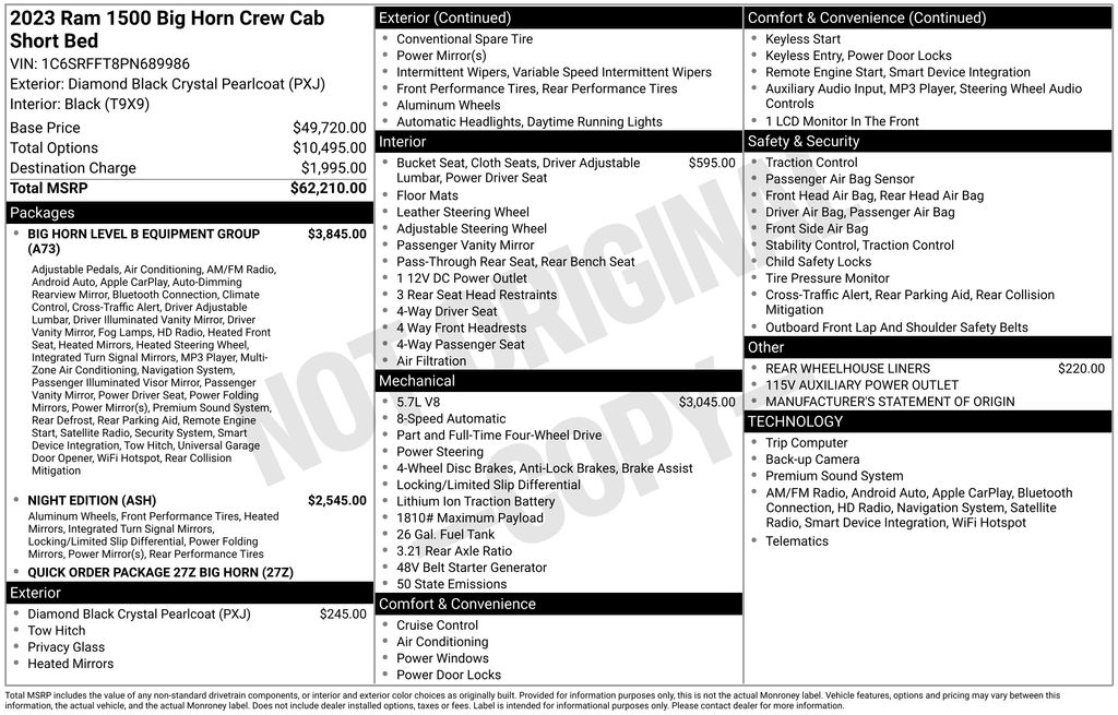 2023 Ram 1500 Big Horn/Lone Star Diamond Black Crystal Pearlcoat HEMI 5.7L V8 Multi Displacement VVT eTorque 8-Speed Automatic 4WD