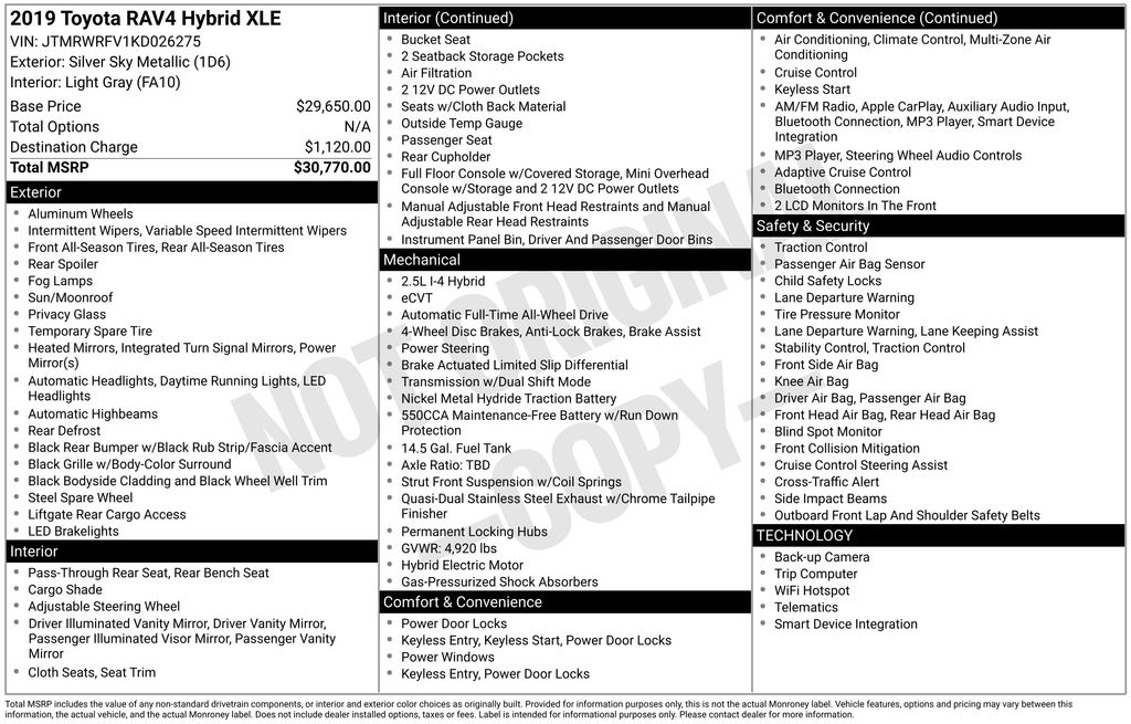 2019 Toyota RAV4 Hybrid XLE Silver Sky Metallic 2.5L 4-Cylinder eCVT AWD